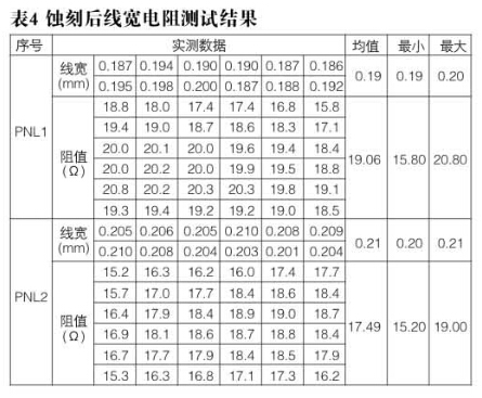 測試板2PNL,蝕刻得到PNL1線寬均值0.19mm,實(shí)測相應(yīng)阻值在15.8到19Ω;PNL2線寬均值0.21mm,實(shí)測相應(yīng)阻值在15.2Ω到17.5Ω。首次作并不確定后流程會對電阻造成多大影響,故繼續(xù)跟進(jìn)測試板到成品后的電阻測試結(jié)果。