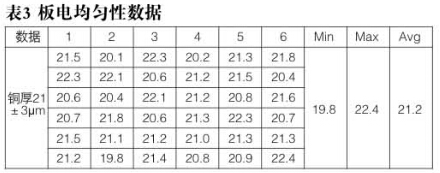 板電銅厚8um,實(shí)際板電后量測量2PNL板的面銅,量測后計(jì)算銅厚分布Cpk為1.4>1.33,如表3,板電均勻性比較理想。