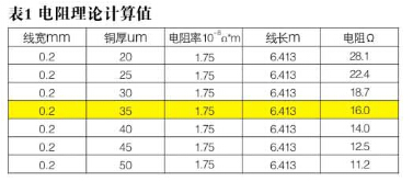 6413mm長,0.2mm寬的銅導(dǎo)線在不同銅厚下的電阻理論計(jì)算值如下表。R=ρ*L/S,ρ為材料電阻率 1.75*10-8Ω*m,L為導(dǎo)線長度6413mm,S為導(dǎo)線橫 截面積,實(shí)際電阻上下限分別為:17.6Ω和14.4Ω。 理論計(jì)算當(dāng)銅厚在35um時(shí),0.2mm寬6413mm長的導(dǎo)線才能達(dá)到理想電阻值16Ω。