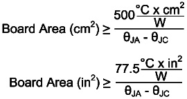 所需的PCB板面積近似值未考慮到散熱孔所發(fā)揮的作用,這些散熱孔將熱量從頂部金屬層(封裝連接至PCB)向底部金屬層傳遞。底層用作二表面層,對(duì)流可以從這里將板上的熱量傳送出去。為了使板面積近似值有效,需使用至少8~10個(gè)散熱孔。散熱孔的熱阻近似于下列方程式值。