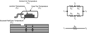 從半導(dǎo)體結(jié)到這些器件外封裝的熱阻抗(θJC)為1.9℃/W。雖然達(dá)到行業(yè)領(lǐng)先的θJC值就很理想,但當(dāng)外封裝到空氣的熱阻抗(θCA)太大時(shí),低θJC值也毫無(wú)意義!如果沒(méi)有提供與周?chē)諝庀嗤ǖ牡妥杩股崧窂剑瑒t熱量就會(huì)聚集在裸焊盤(pán)上無(wú)法消散。那么,究竟是什么決定了θCA值呢?從裸焊盤(pán)到空氣的熱阻完全受PCB設(shè)計(jì)以及相關(guān)的散熱片的控制。