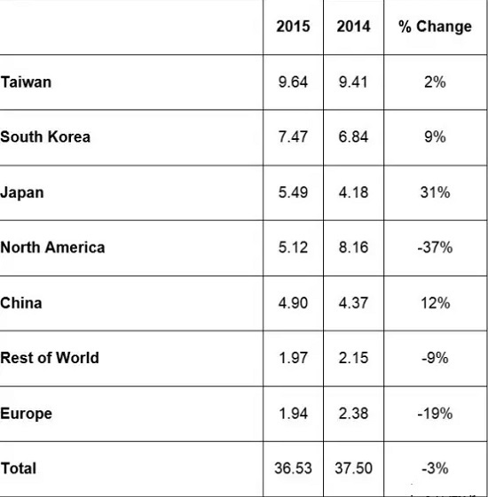 際半導(dǎo)體設(shè)備與材料協(xié)會-SEMI3月14日公布:2015年全球半導(dǎo)體制造設(shè)備總銷售為365.3億美元,較上一年減少了3%。2015年總設(shè)備訂單比2014年低5%。