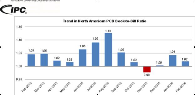 2016年3月31日,IPC發(fā)布《2016年2月份北美地區(qū)PCB行業(yè)調(diào)研統(tǒng)計(jì)報(bào)告》。報(bào)告顯示,2月份PCB銷量反彈,強(qiáng)于訂單量,訂單出貨比由此回落至1.02。