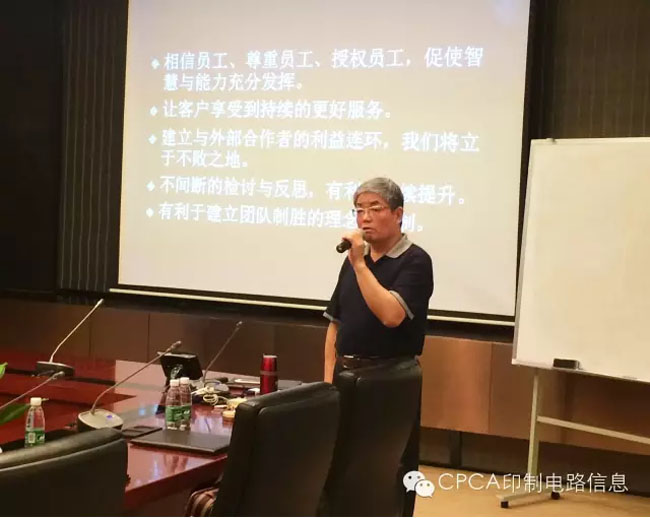 20日上午,資深專家閆海忠先生首先開講。閆海忠先生,研究員級高級工程師。曾任南方航空動力機械公司工藝員、工程師、技術室主任、分廠廠長,原深圳中航集團下屬深南電路股份有限公司總經(jīng)理,現(xiàn)CPCA顧問。2005年~2012年在深圳中航集團分管《管理創(chuàng)新和精益六西格瑪管理推廣》工作,具有廣泛的企業(yè)管理和精益生產(chǎn)管理經(jīng)驗。深南電路歷年來持續(xù)推進管理創(chuàng)新工作,各種管理方法工具諸如TQC、6S、六西格瑪、精益生產(chǎn)、項目管理等得到了深入、全面的應用,管理創(chuàng)新活動和實踐敢為人先,取得了良好的成效,為先進管理理念和方法的推廣起到了積極的垂范作用!本次專題培訓主要由閆海忠專家傳授精益生產(chǎn)的課程,內(nèi)容包括:精益管理理念、精益生產(chǎn)管理的實質追求、精益生產(chǎn)管理的路徑和方法。閆老師特別指出,精益生產(chǎn)不是一項孤立的管理工作。