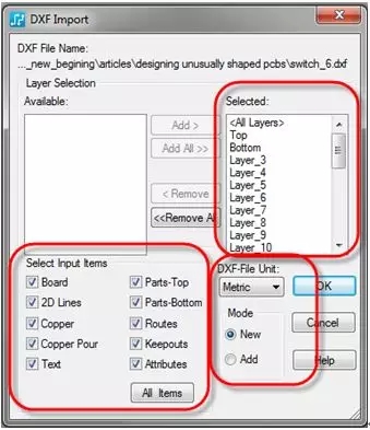 圖 5:PCB 設計工具(如這里介紹的 PADS)需要能夠使用 DXF 格式控制所需的各種參數(shù)。