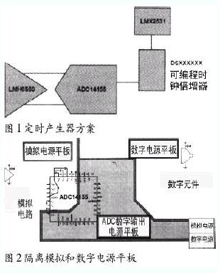 由于很多系統(tǒng)通過(guò)背板或另外連接分配參考時(shí)鐘,這會(huì)降低信號(hào)質(zhì)量,所以,通常用本機(jī)振蕩器(低相位噪聲的VCXD)做為ADC的定時(shí)源。圖1示出用NS公司的LMX2531時(shí)鐘合成實(shí)現(xiàn)定時(shí)產(chǎn)生。連接到定時(shí)產(chǎn)生器的LMX2531由可編程分頻器合成器輸出,給出小于100毫微微秒的抖動(dòng)性能。