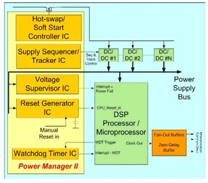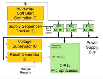 在本文中,電源管理被簡單定義為:對PCB上的全部電源實施管理(包括:DC-DC轉(zhuǎn)換器、LDO等)。電源管理包括如下功能:管理PCB上DC-DC控制器。例如,熱插拔、軟啟動、排序、追蹤、容限和規(guī)整;生成全部相關(guān)的電源狀態(tài)和控制邏輯信號。例如,復(fù)位信號生成、電源故障指示(監(jiān)控)和電壓管理。圖1演示了一個采用CPU或微處理器的PCB上的典型電源管理功能;熱插拔/軟啟動控制功能用于限制浪涌電流以減小電源的啟動負載。對插入有源(live)基板的PCB來說,這是個重要功能;電源排序和跟蹤功能用于在滿足PCB上的全部器件對上電順序要求的前提下,控制如何開/關(guān)多個電源。對所有電壓進行故障(過/欠壓)監(jiān)測以向處理器就即將發(fā)生的電源故障進行預(yù)警。該功能也被稱為“監(jiān)管功能”。