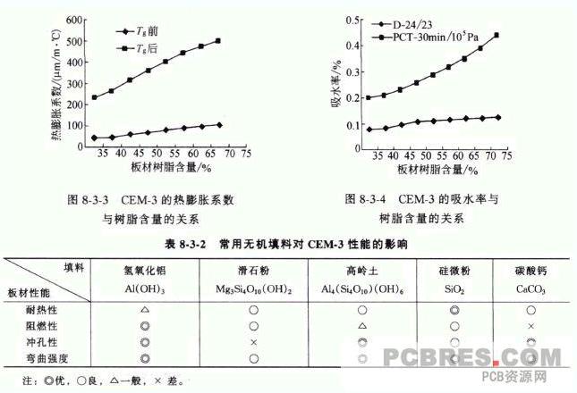 (3)無(wú)機(jī)填料無(wú)機(jī)填料是CEM-3 的重要組分之一,作為填充劑,它直接影響板材的尺寸穩(wěn)定性、通孔可靠性、耐潮濕性和機(jī)械加工性等。初的CEM-3 不含有無(wú)機(jī)填料,玻纖紙的含膠量大,使到板材有機(jī)物(環(huán)氧樹(shù)脂固化物)含量高達(dá)60% ,導(dǎo)致板材熱膨脹數(shù)和吸水率偏大,然而早期CEM-3 主要用于單面印制線路板,不需考慮通孔可靠性,耐潮濕性即使差一點(diǎn),問(wèn)題也不大;隨著CEM-3 應(yīng)用范圍的擴(kuò)大,特別是在雙面印制線路板上的應(yīng)用,這些問(wèn)題就暴露出來(lái)。后來(lái),通過(guò)在芯料用膠液中加入無(wú)機(jī)填料,大大提高CEM-3的無(wú)機(jī)物比例,使板材中有機(jī)物含量和無(wú)機(jī)物含量的比例下降為40: 60 (質(zhì)量份) ,接近FR-4 水平,顯著地降低板材的熱膨脹系數(shù)和吸水率,圖8-3-3 、圖8-3-4 顯示了CEM-3 的樹(shù)脂含量(即有機(jī)物含量,通過(guò)無(wú)機(jī)填料用量來(lái)調(diào)整)與板材熱膨脹系數(shù)、吸水率的關(guān)系。CEM-3 常用的元機(jī)填料有氫氧化鋁、滑石粉、碳酸鈣、硅微粉、高嶺土等,它們對(duì)CEM-3 性能的影響見(jiàn)表8-3-2 。目前CEM-3 大量使用的無(wú)機(jī)填料是氫氧化鋁,氫氧化鋁含有3 個(gè)結(jié)晶水,在200 - 500 C條件下,不同程度釋放出水,在釋放水時(shí),需吸收大量的熱量,所以氫氧化鋁也是一種理想的"潔凈"阻燃劑,氫氧化鋁的粒徑越小,阻燃效果越好;但是,氫氧化鋁會(huì)影響板材的耐熱性、耐浸焊性, PCB 加工熱風(fēng)整平、元件焊接的溫度都接近氫氧化鋁的分解溫度,如果時(shí)間較長(zhǎng),高溫下氫氧化鋁受熱分解,板材會(huì)分層起泡;近年有廠家研究對(duì)氫氧化鋁進(jìn)行熱處理,脫去部分在200 多度開(kāi)始分解的結(jié)晶水,可大大提高氫氧化鋁的熱分解溫度,這種含有1. 8-2.9 個(gè)結(jié)晶水的氫氧化鋁已開(kāi)始供應(yīng)市場(chǎng)。