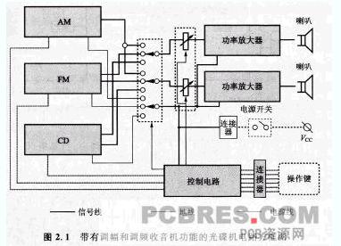 例如,在設(shè)計(jì)一個(模擬)光碟(CD) 機(jī)或者數(shù)字光碟(DVD) 機(jī)的電路時,在整個電器裝置的印制線路板中,既有模擬電路又有數(shù)字電路,這時候應(yīng)當(dāng)特別注意不要讓數(shù)字電路的信號干擾模擬電路的正常工作。為此,往往將這類電路原理圖首先分割成各部分分別具有不同功能的方框圖,并且明顯地標(biāo)識出哪些導(dǎo)線是信號線,哪些導(dǎo)線是電摞線,哪些導(dǎo)線是接地線或屏蔽線。圖2. 1 是將一個帶有調(diào)幅和調(diào)頻收音機(jī)接收功能的光碟機(jī)方框圖分別標(biāo)識出信號線、電源線與接地線的例子。