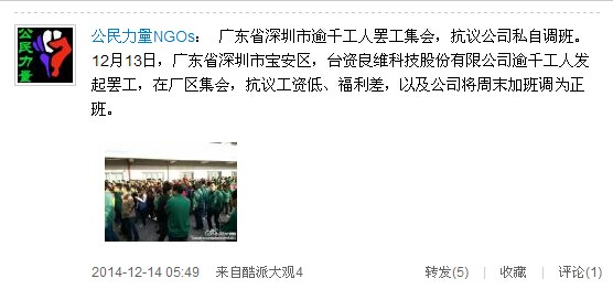 據(jù)網(wǎng)友發(fā)布的微博顯示,當(dāng)日逾千名工人冒著寒風(fēng)聚集在廠區(qū)內(nèi),有人握拳舉手,高呼口號,而警方及保安則在場維持秩序,雙方未見沖突。另有一名手持?jǐn)U音器,疑似廠方負(fù)責(zé)人站在人群前,與數(shù)名工人討論。