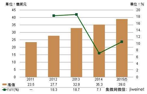 雖自2011年以來,全球智慧型手機(jī)出貨量年成長率即呈現(xiàn)逐年下滑態(tài)勢,但2015年預(yù)估仍能維持2位數(shù)年成長幅度,加上來自大陸IC內(nèi)需市場規(guī)模亦持續(xù)成長,使得同期大陸IC設(shè)計(jì)業(yè)產(chǎn)值仍將能維持20%以上的成長動(dòng)能。在大陸IC設(shè)計(jì)產(chǎn)業(yè)強(qiáng)勁成長帶動(dòng)下,DIGITIMESResearch預(yù)估,2015年大陸晶圓代工產(chǎn)業(yè)產(chǎn)值將達(dá)39億美元,較2014年成長10.5%。
