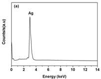 由加入還原劑硼氫化鉀和分散劑PAAS得到的納米銀樣品進(jìn)行EDX元素和SAED分析結(jié)果,分別如圖4 (a)和(b)所示。從圖4 (a)看出,得到的為純銀,無(wú)其他雜元素存在;圖4(b)的SAED分析表明,得到的納米銀是單晶,再次證明無(wú)其他氧化物或者其他晶態(tài)物質(zhì)存在。