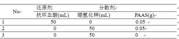 將相同量0.8 gAgNO3 分別溶于少量的水中,加入100 ml的去離子水,充分?jǐn)嚢枋蛊淙芙?,分別用不同的還原劑和分散劑:還原劑為抗壞血酸和硼氫化鉀,其濃度均為1.0×10-3 mol/L,分散劑為PAAS,加入不同的量,見(jiàn)表一。然后攪拌使其均勻分散于溶劑中,在常溫下反應(yīng)3 h,然后將所得到的懸濁液以10000 r/min的轉(zhuǎn)速離心分離10 min,后將所得的產(chǎn)品于65℃真空干燥箱中干燥8 h。