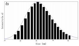 圖3為納米銀粒子的粒徑分布圖,從圖3(a)可以看出,用抗壞血酸加入PAAS分散劑,粒子分布較寬,在大的粒徑范圍(100-1000 nm)之間有粒子存在,說(shuō)明此方法得到的納米銀有一定的團(tuán)聚及大小不均一。在圖3(b)中,粒子呈現(xiàn)出正態(tài)分布性,大部分粒子的粒徑在30-40 nm之間,無(wú)明顯的大粒徑的銀粒子出現(xiàn)。圖3(c)表明,在10-100 nm之間有粒子存在,粒徑分布較寬,在大的粒徑范圍(50-100 nm)有粒子存在。從上面實(shí)驗(yàn)分析得出,說(shuō)明分散劑PAAS有利于納米粒子的分散性,可以阻止其團(tuán)聚。